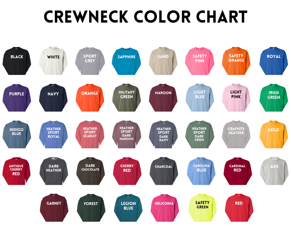 COLOR: Please note color of t-shirt or crewneck at checkout under "Order Special Instructions". Text will be white for darker colored shirts.